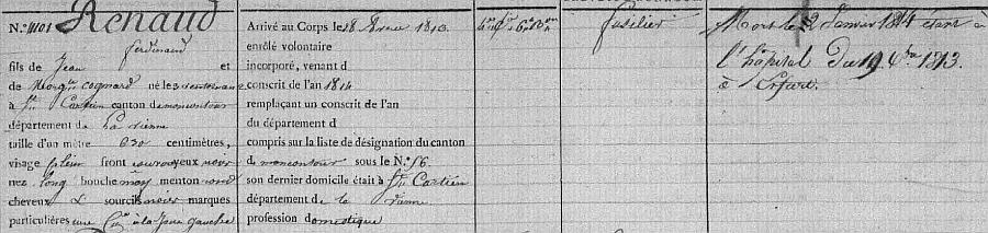 Mort le 2 Janvier 1814 étant à l'Hôpital du 19 Décembre 1813 à Erfurt.