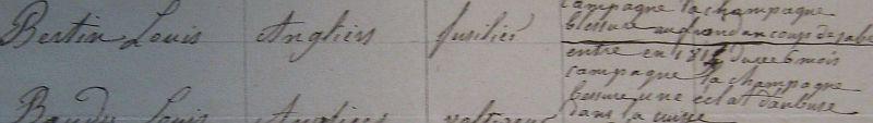 Fusilier. Entré en 1814 pour une durée de 6 mois. Campagnes: Champagne. Blessé d'un éclat d'obus dans la cuisse. |